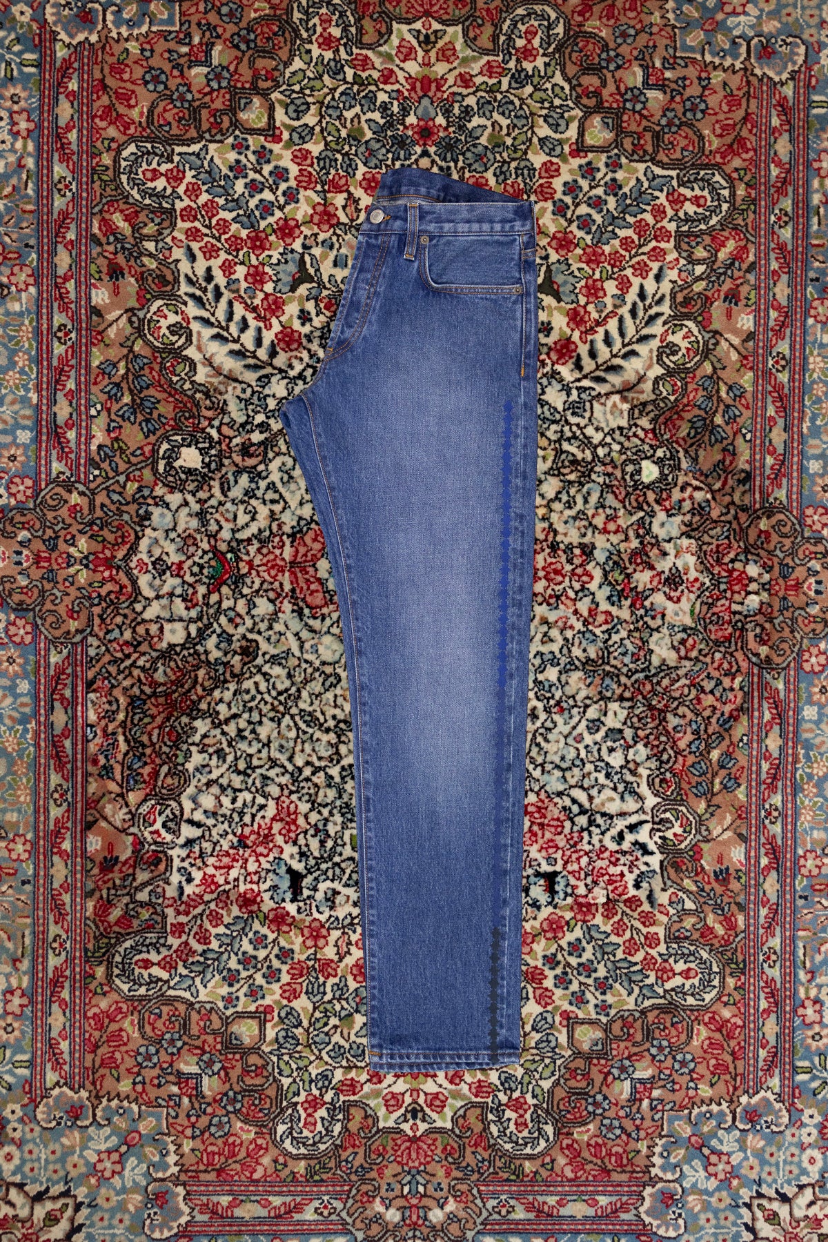 Questa versione presentava un fallo di tessuto sul fianco della gamba sinistra. Questi pantaloni sono stati interamente aperti fino all'altezza delle tasche e ricamati con questo ricamo stelle etniche che sfumano colore lungo la gamba. Le nostre sapienti sarte hanno poi riassemblato le gambe ed i fondi.