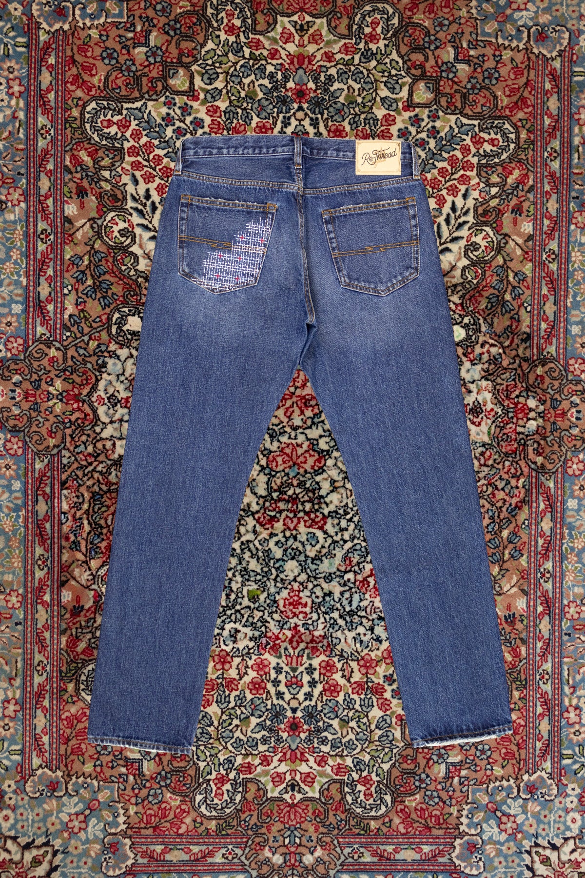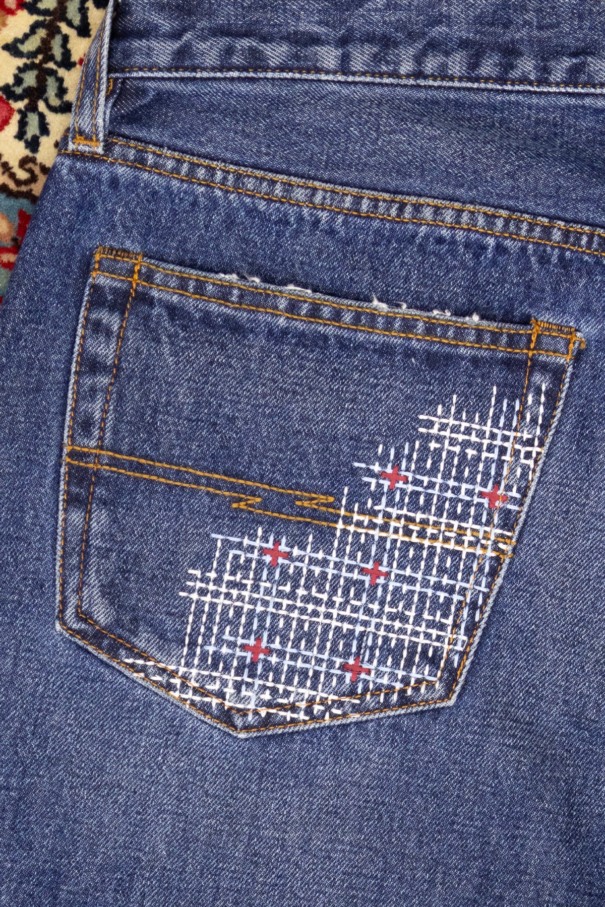 Questa versione presentava un fallo di tessuto sul tasca dietro della gamba sinistra. La tasca è stata interamente scucita ed il difetto è stato coperto con questo ricamo in stile sashiko ideato dal team di Barbanera.