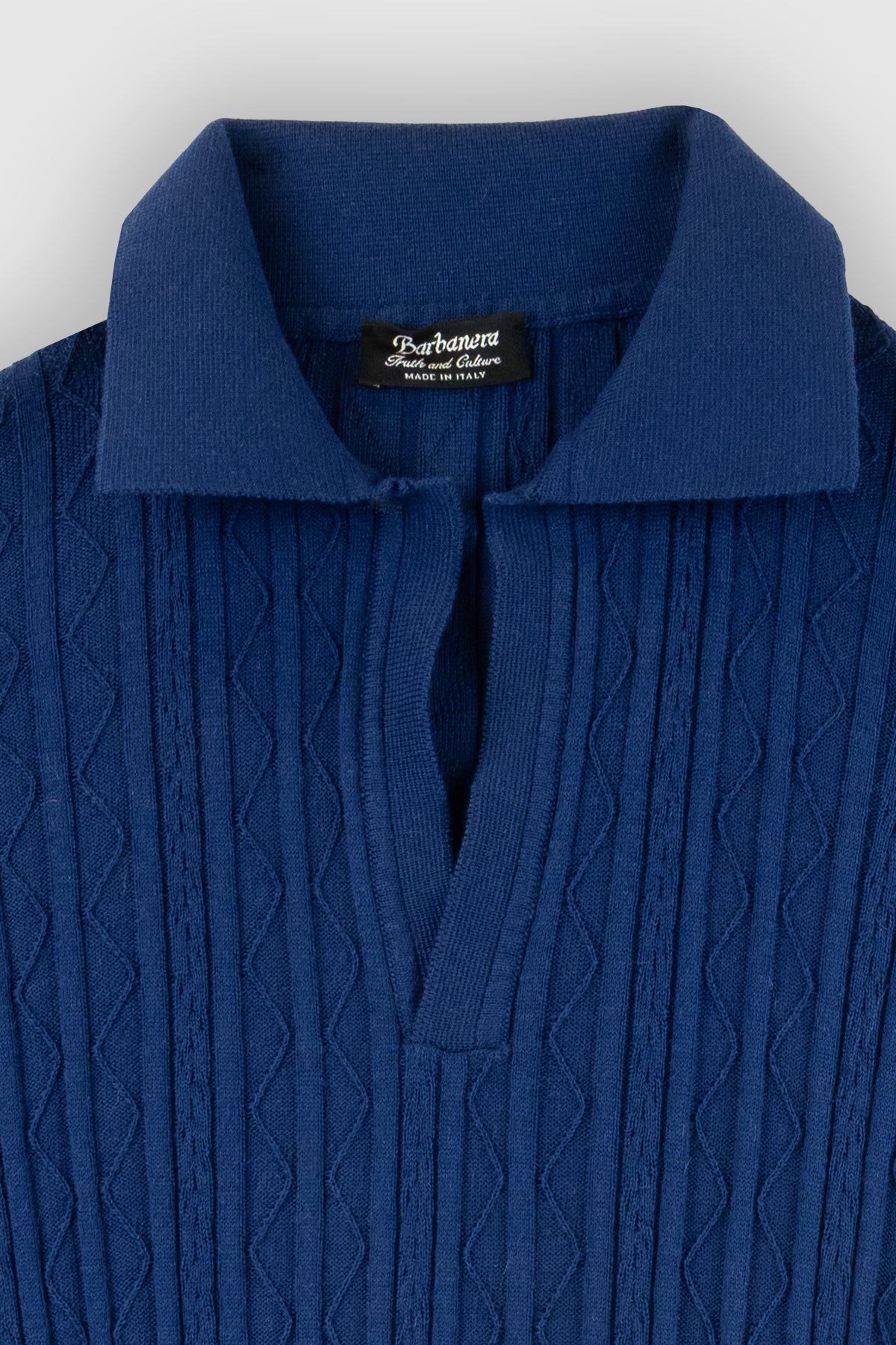 Our polo shirt in this blue version is made of a fine cotton and cashmere blend and features a geometric pattern.