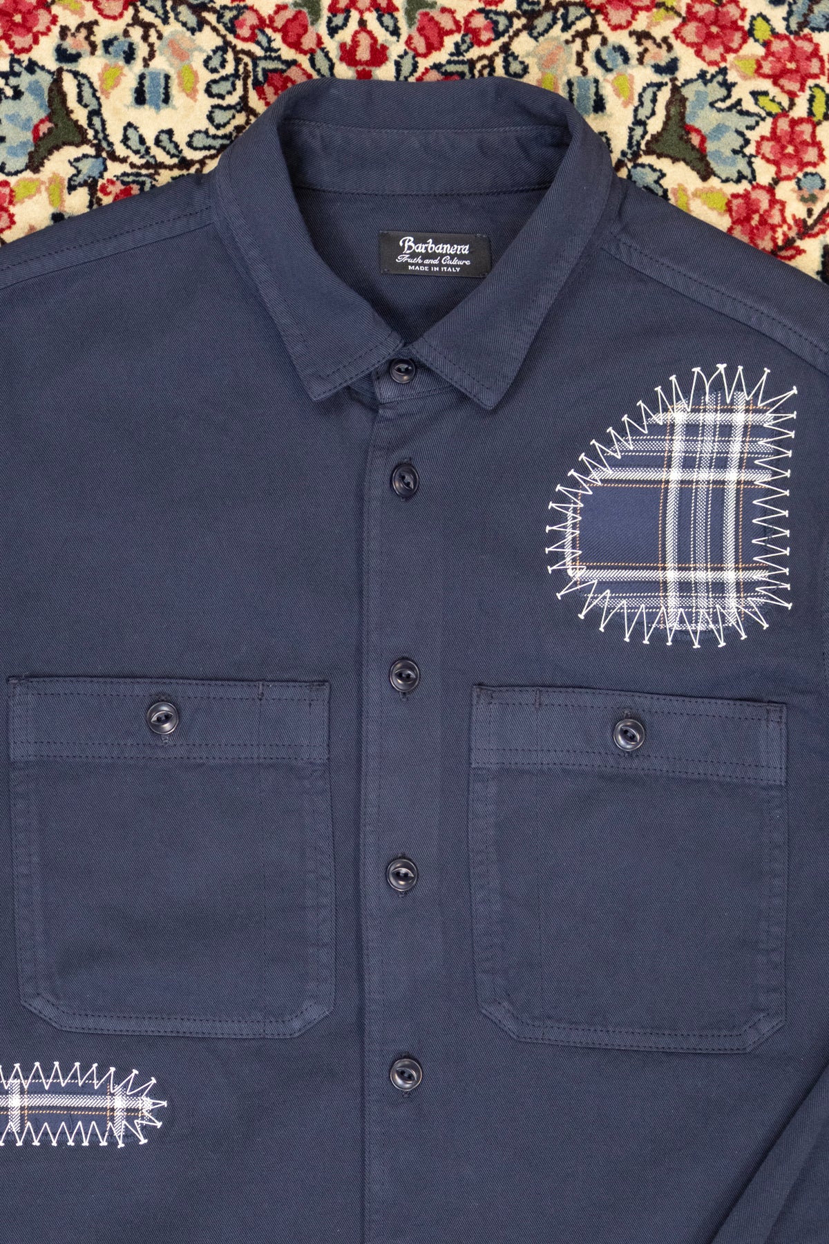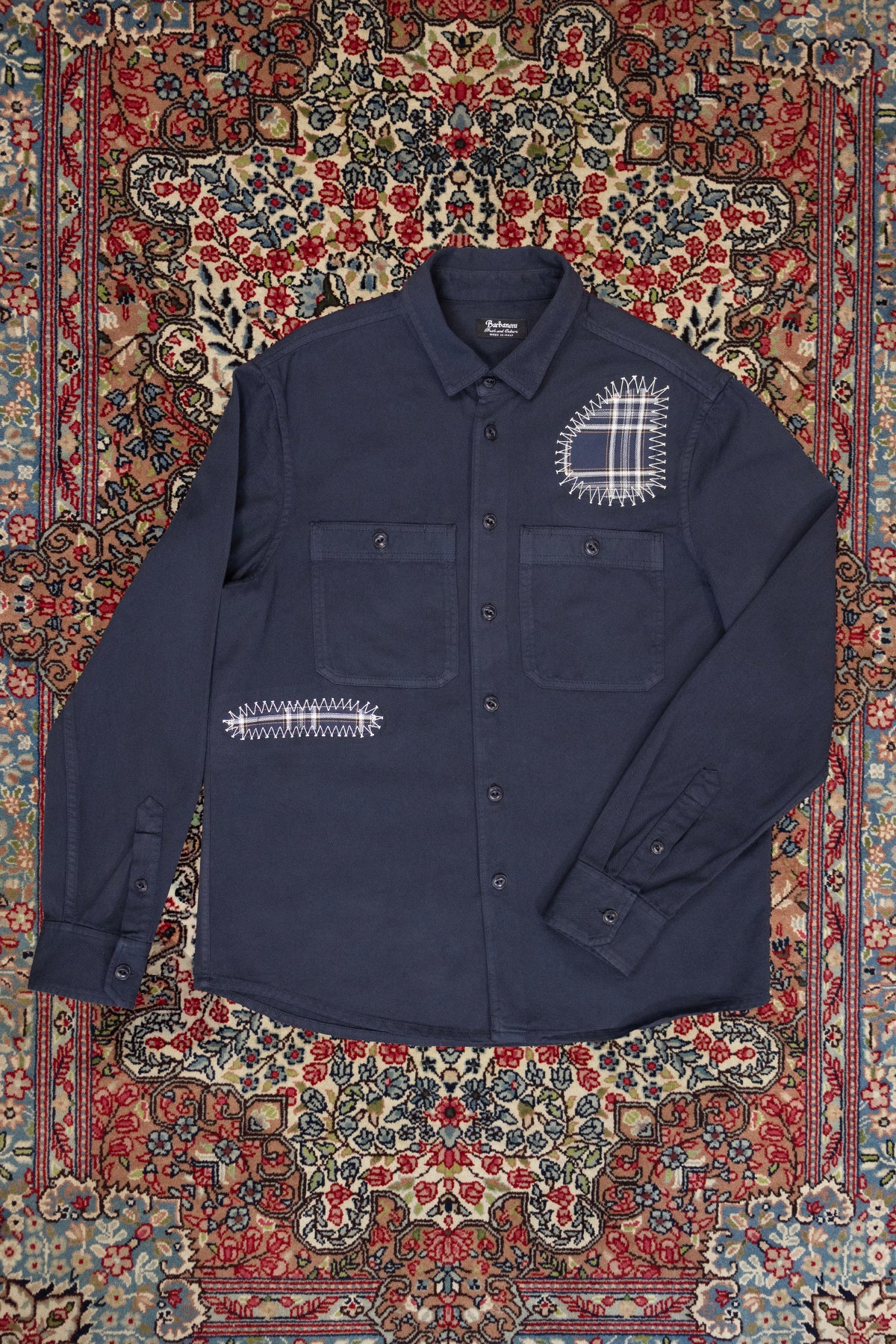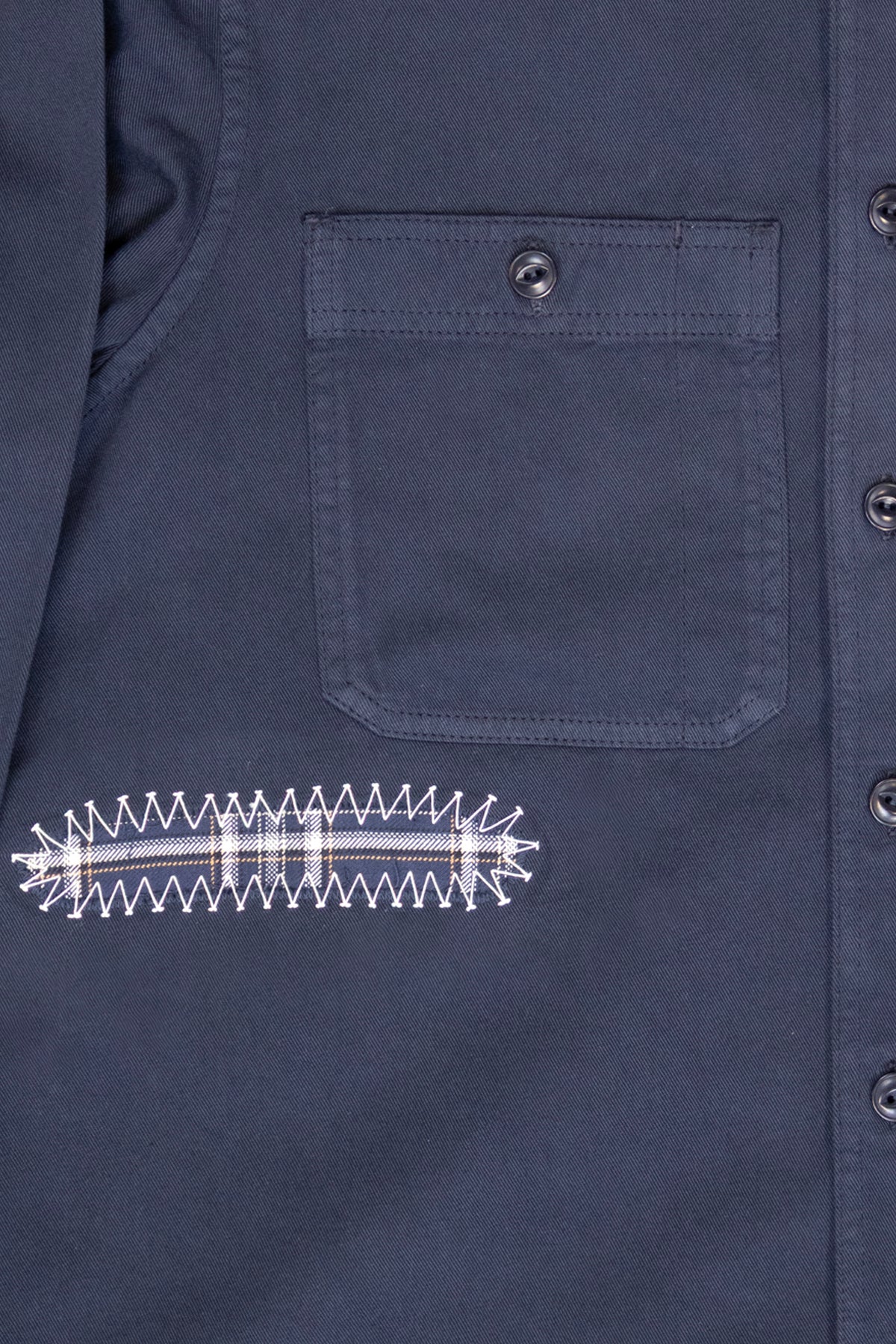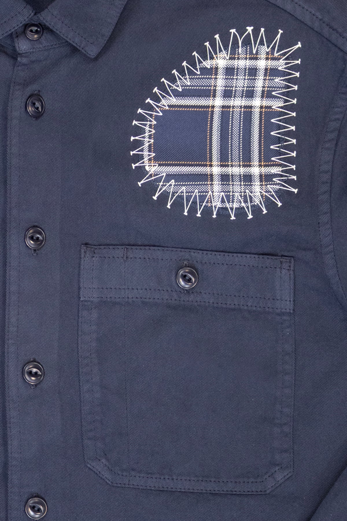This version featured a fabric defect on the front of the overshirt. Thanks to a special collaboration, the defect was first removed and then replaced using scraps from old productions, making this overshirt a completely upcycled piece down to the smallest detail. The checked motif appliques were then embellished with this ethnic zigzag embroidery.