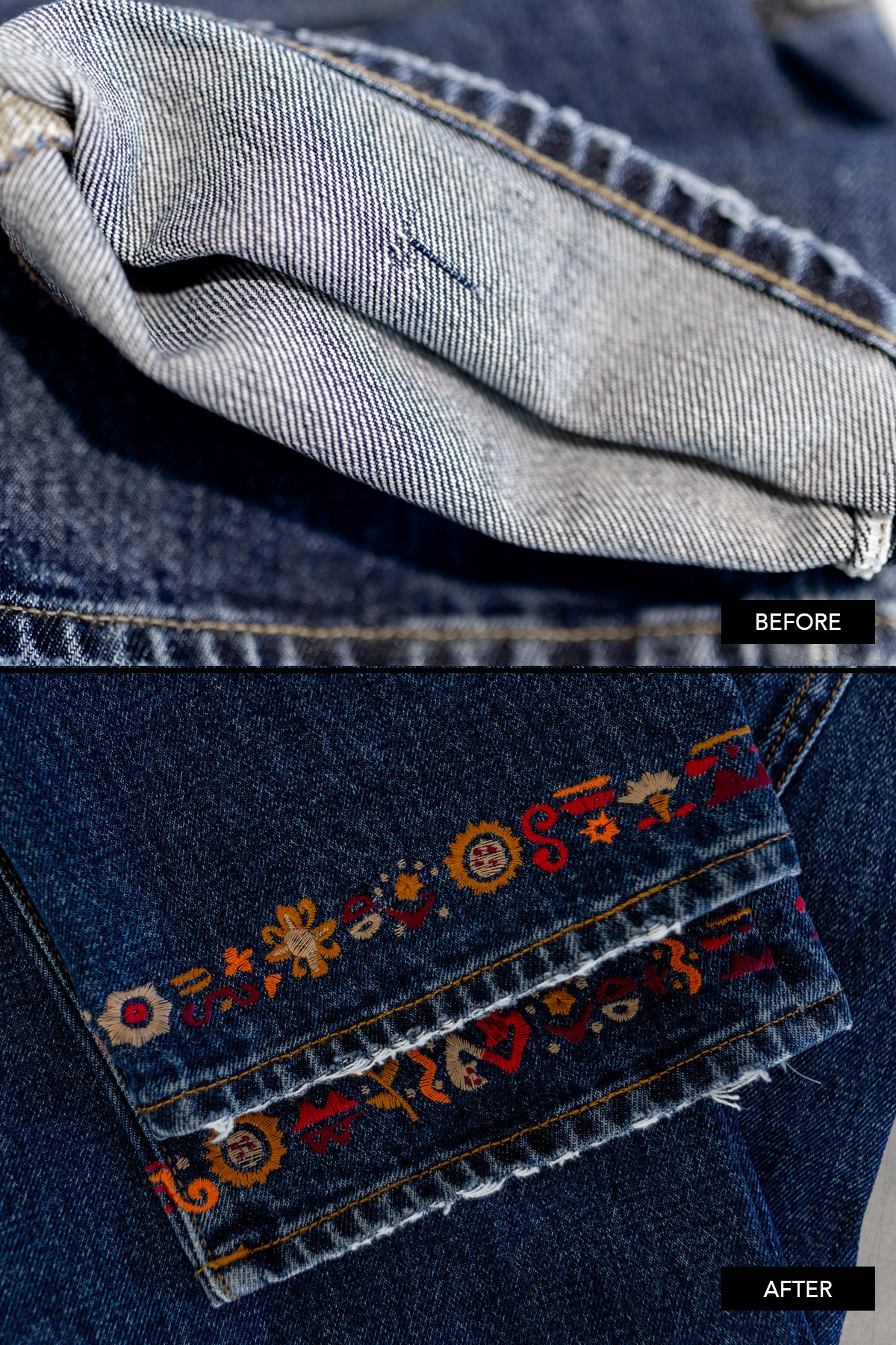 This particular version featured a fabric flaw at the bottom of the leg. Thanks to a special collaboration, the defect has been covered with this ethnic-style embroidery, sourced from an archive of 1980s designs. Completing the piece is the iconic leather patch with the brown “Re-Thread” logo.