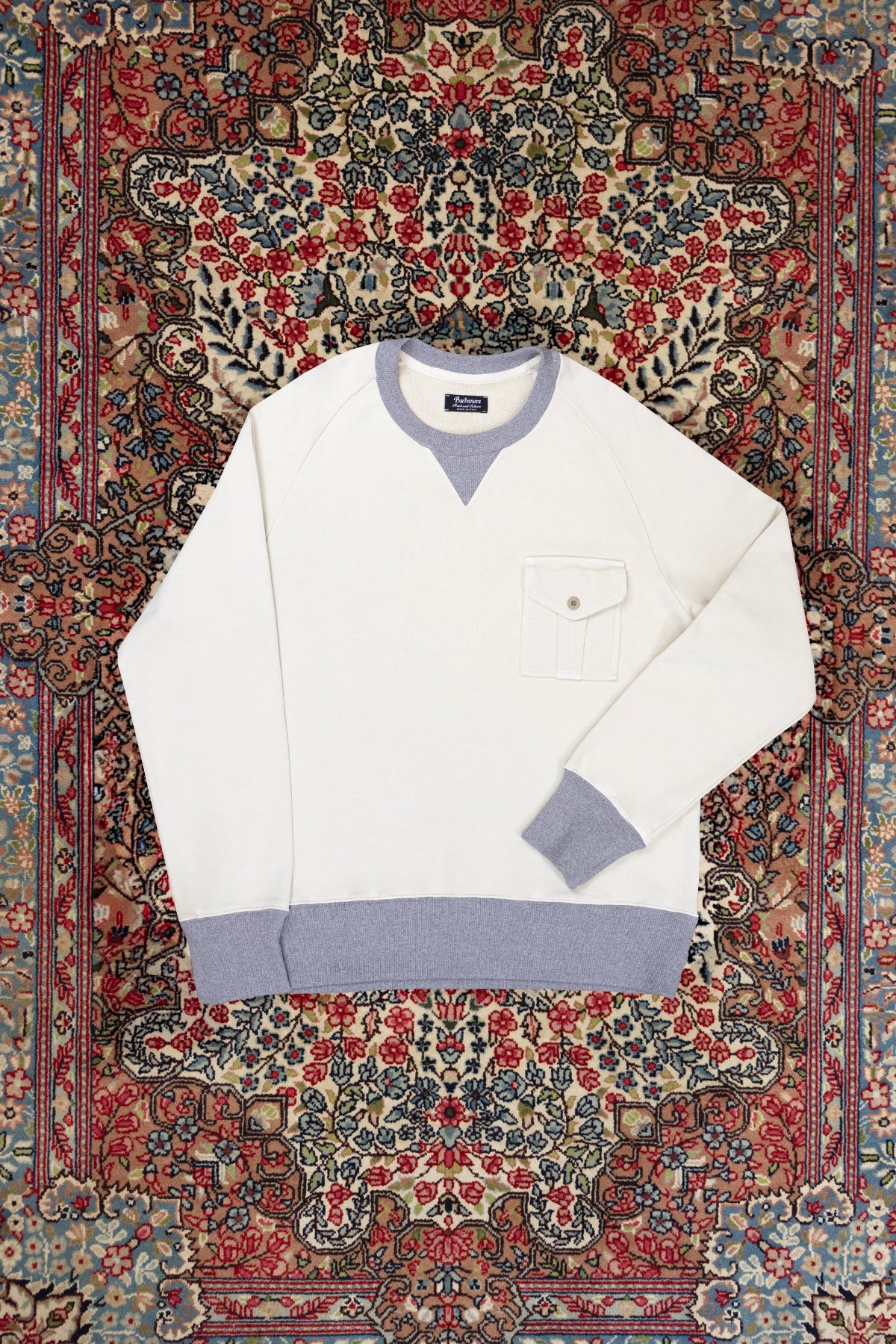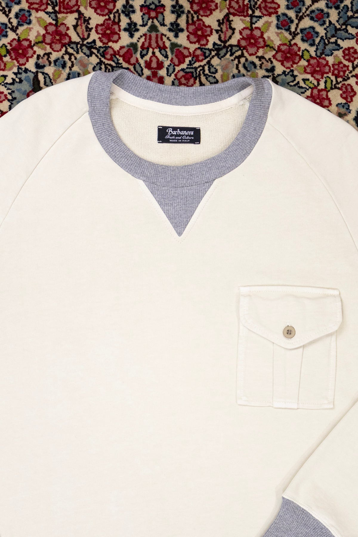 Crafted from premium brushed cotton, it features a regular fit with raglan sleeves for maximum freedom of movement. The triangle insert at the neckline and the chest pocket with tone-on-tone button underline its authentic character.